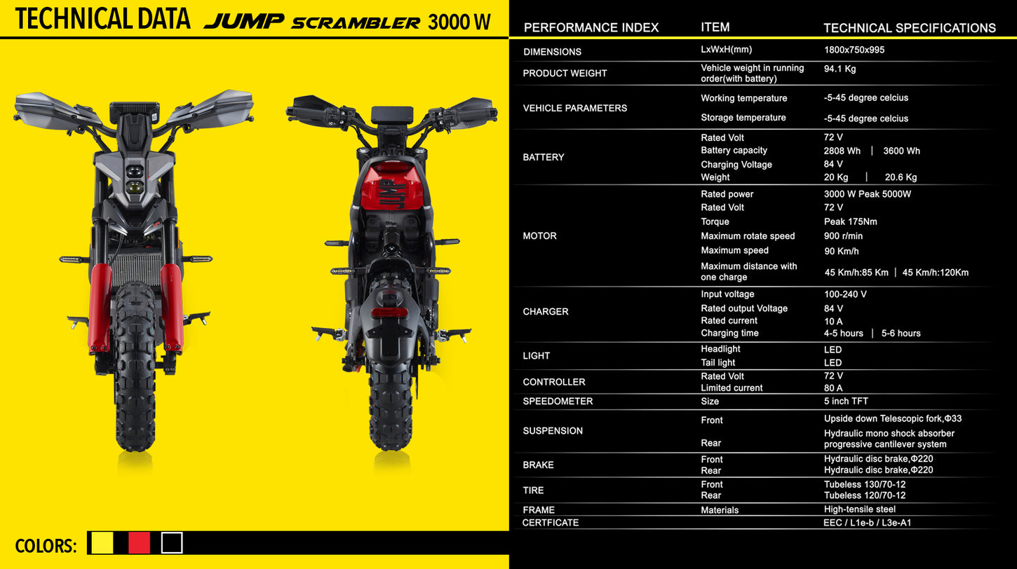 Beneath its rugged exterior lies a beastly 72v Battery paired with an astonishing 3000w Motor. Brace yourself for an electrifying surge of energy as you twist the throttle and unleash the full force of the Jump Scrambler. From rocky trails to sandy dunes, this motorbike conquers it all with effortless precision.